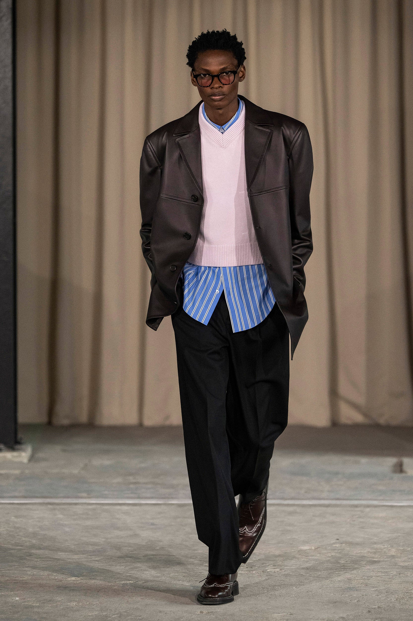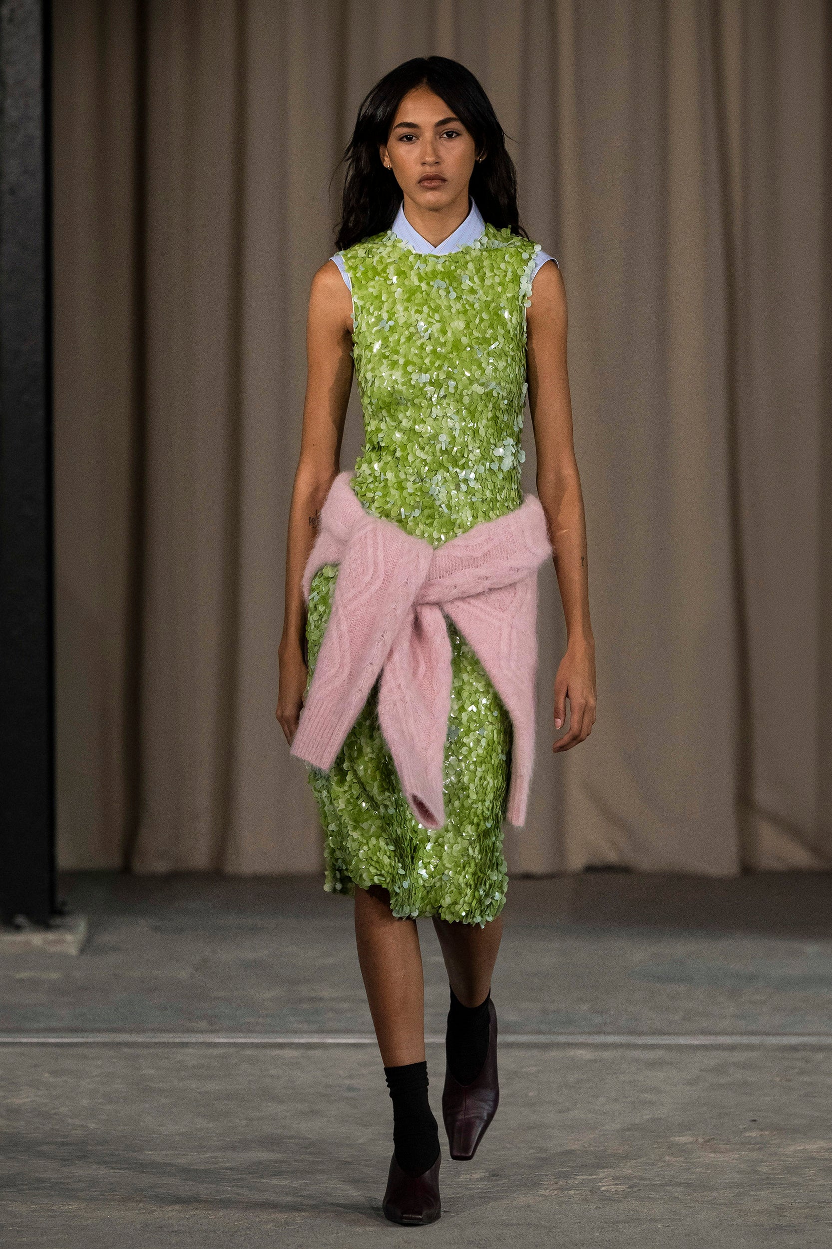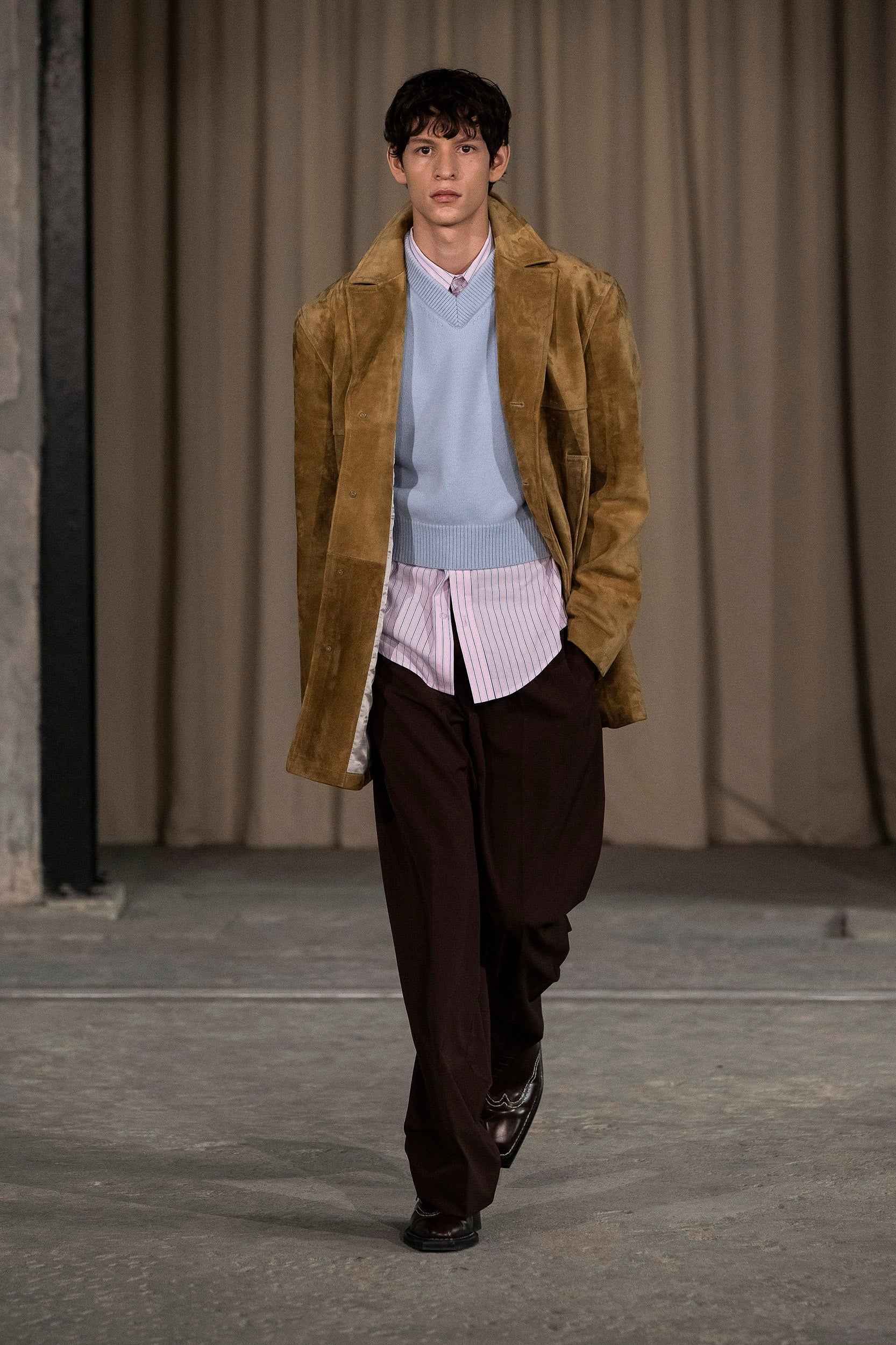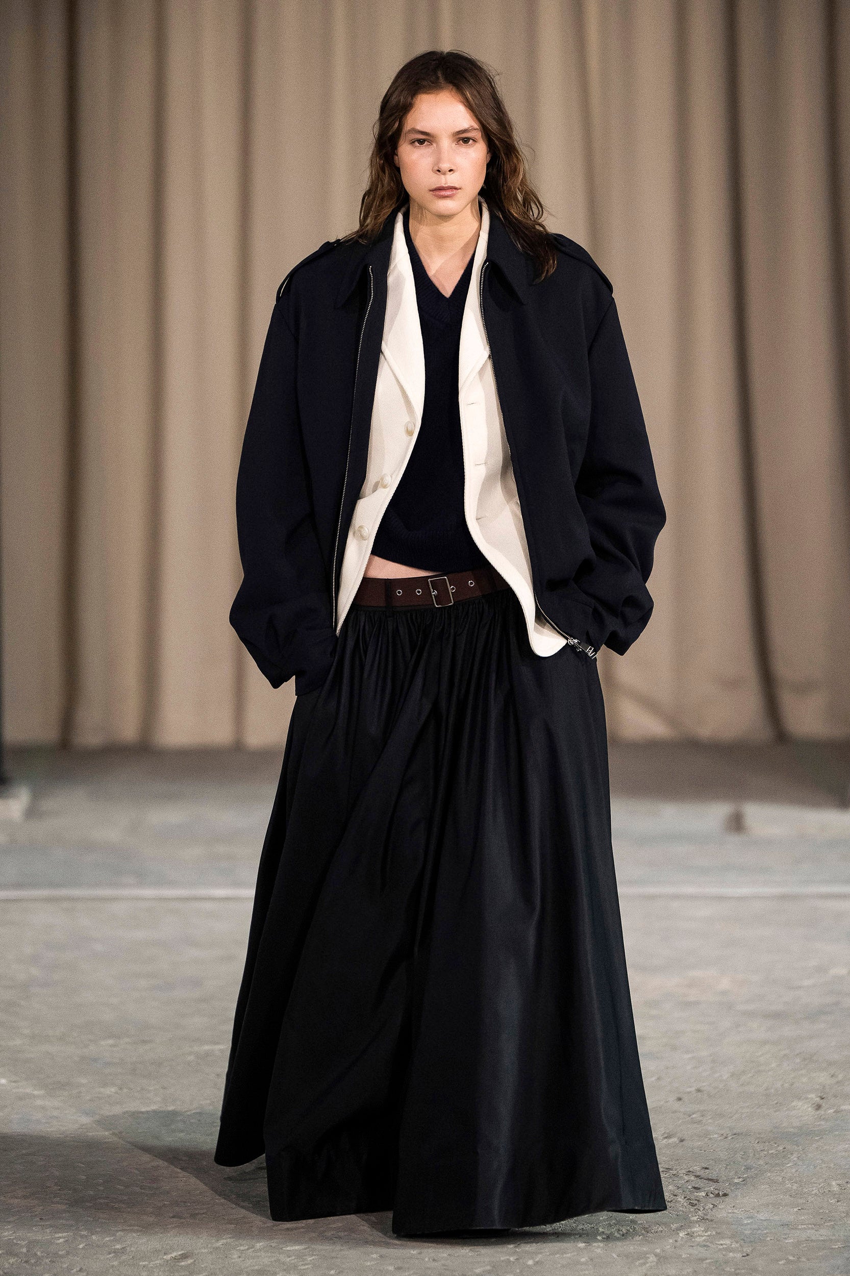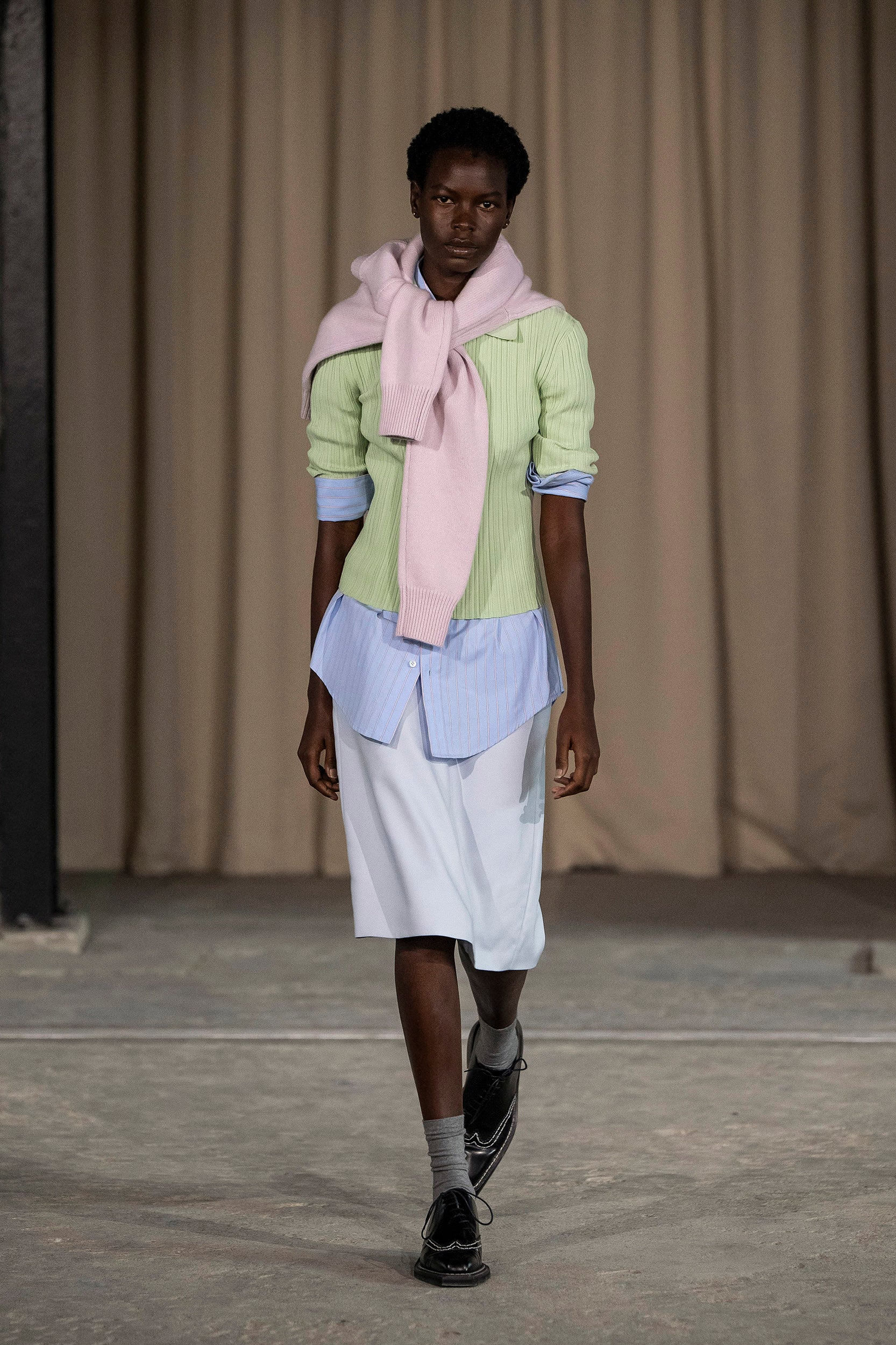 Saccharine pastels clash with rich leathers and wools, while full skirts balance strong-shouldered tailoring. Classic British wardrobe staples are reimagined, layering nostalgia with modernity. Eccentric textures, and playful contrasts redefine tradition, embracing a multifaceted reality.