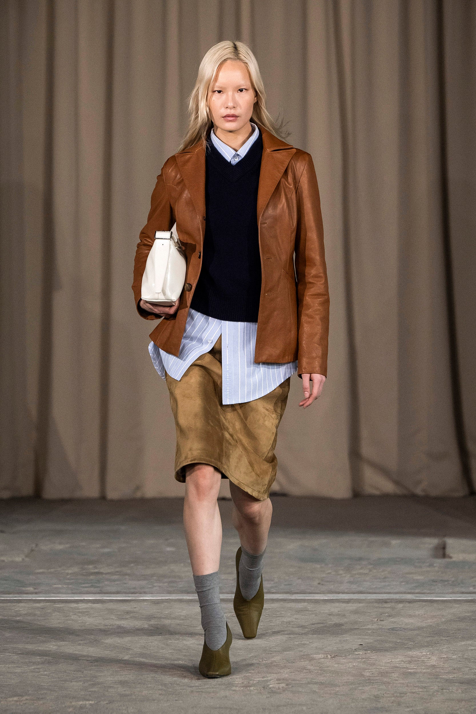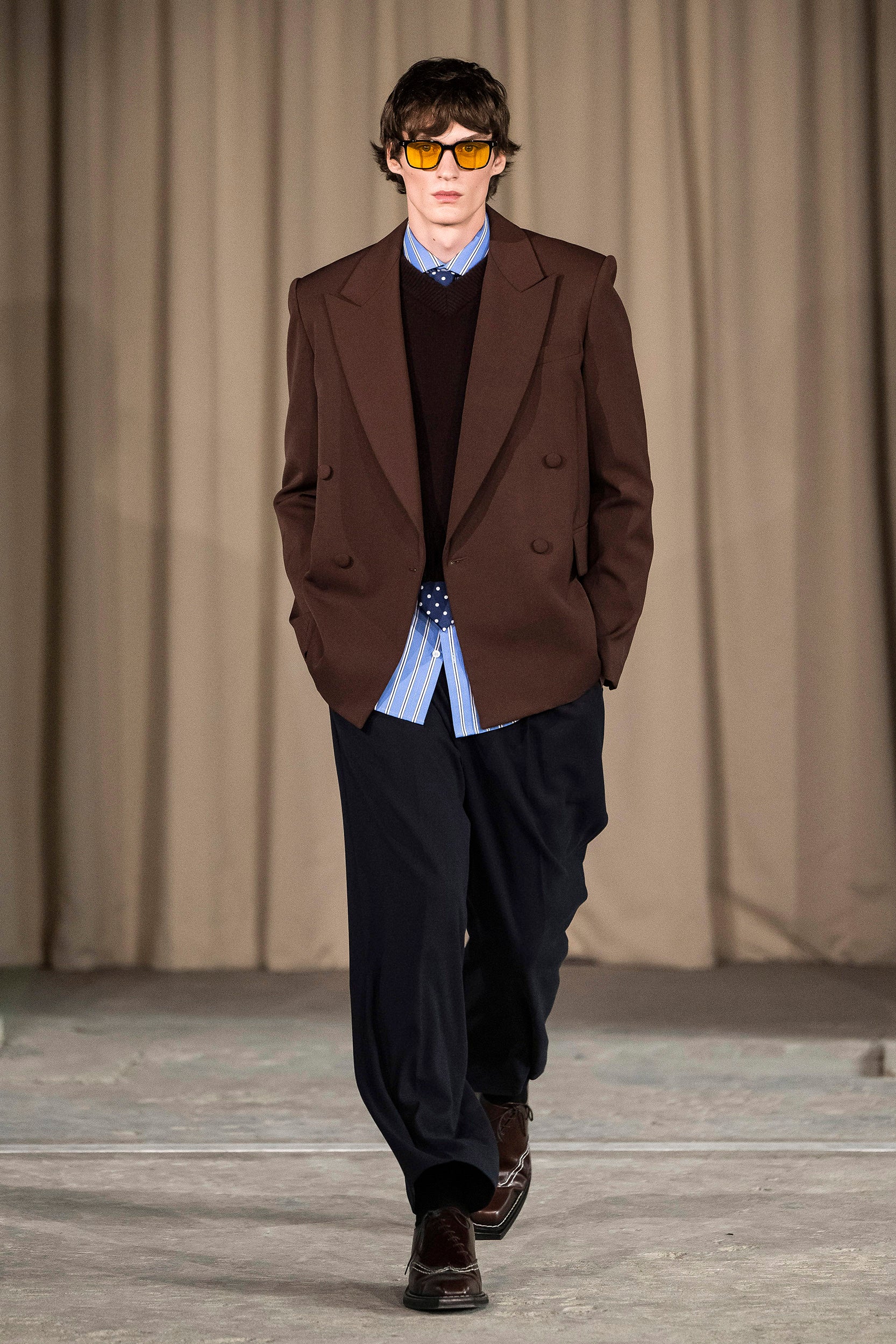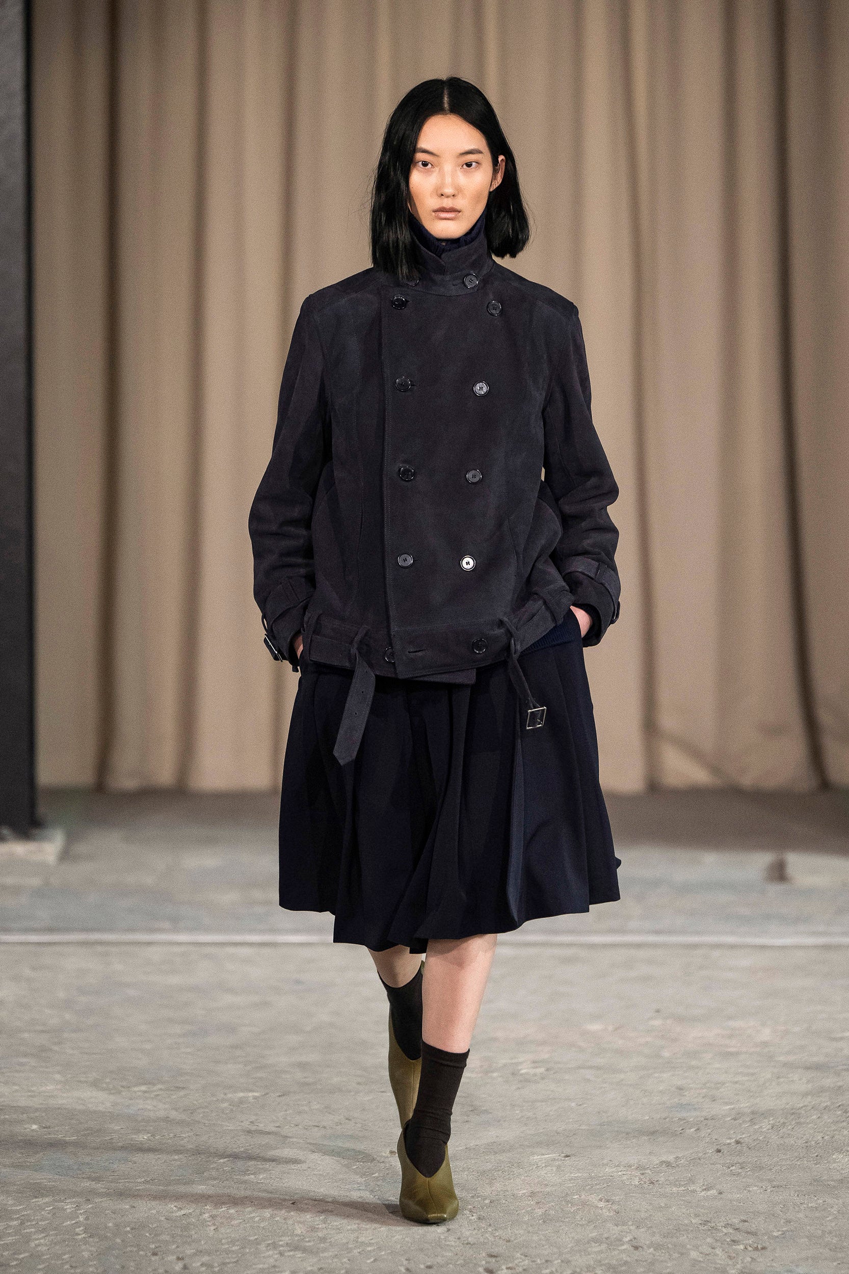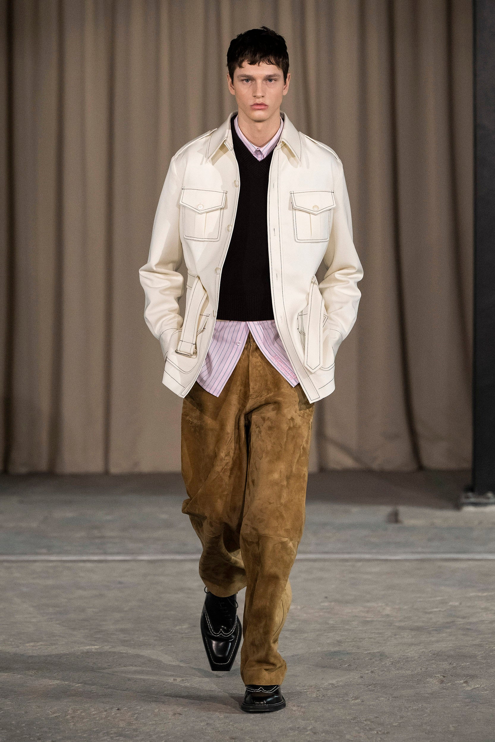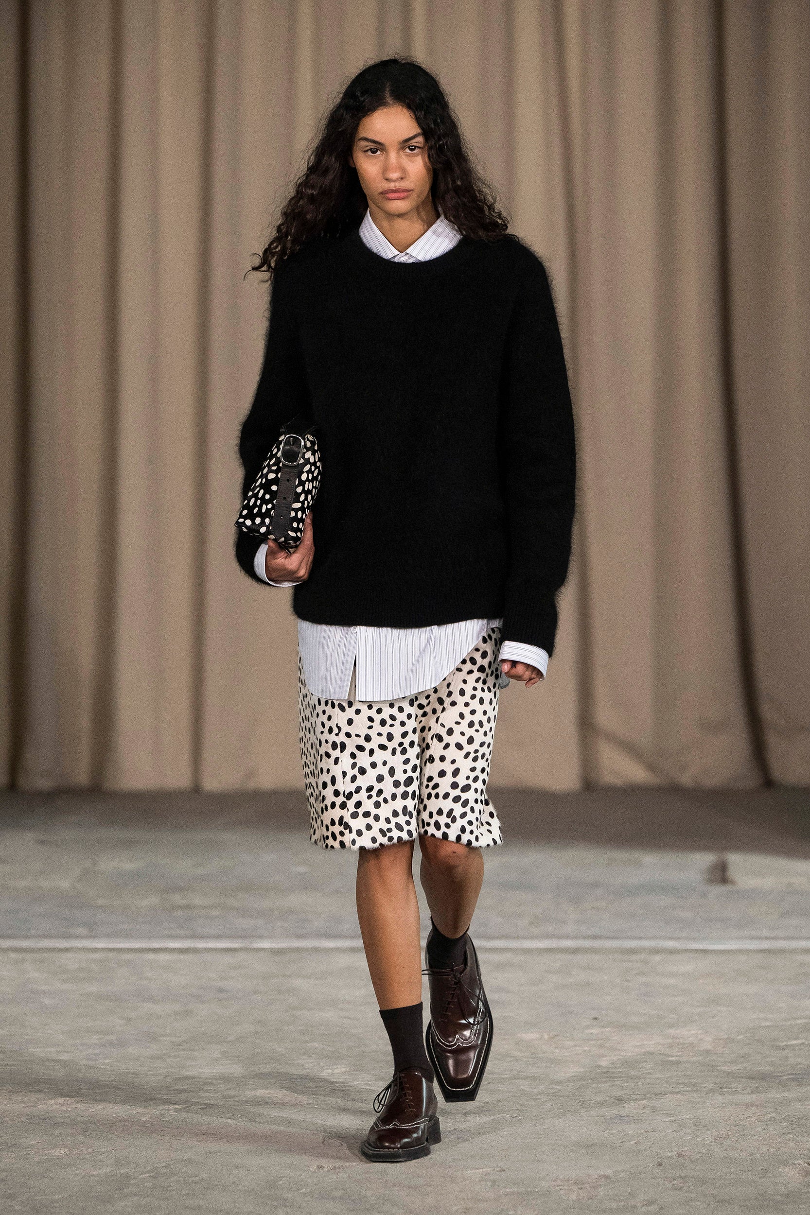 Saccharine pastels clash with rich leathers and wools, while full skirts balance strong-shouldered tailoring. Classic British wardrobe staples are reimagined, layering nostalgia with modernity. Eccentric textures, and playful contrasts redefine tradition, embracing a multifaceted reality.