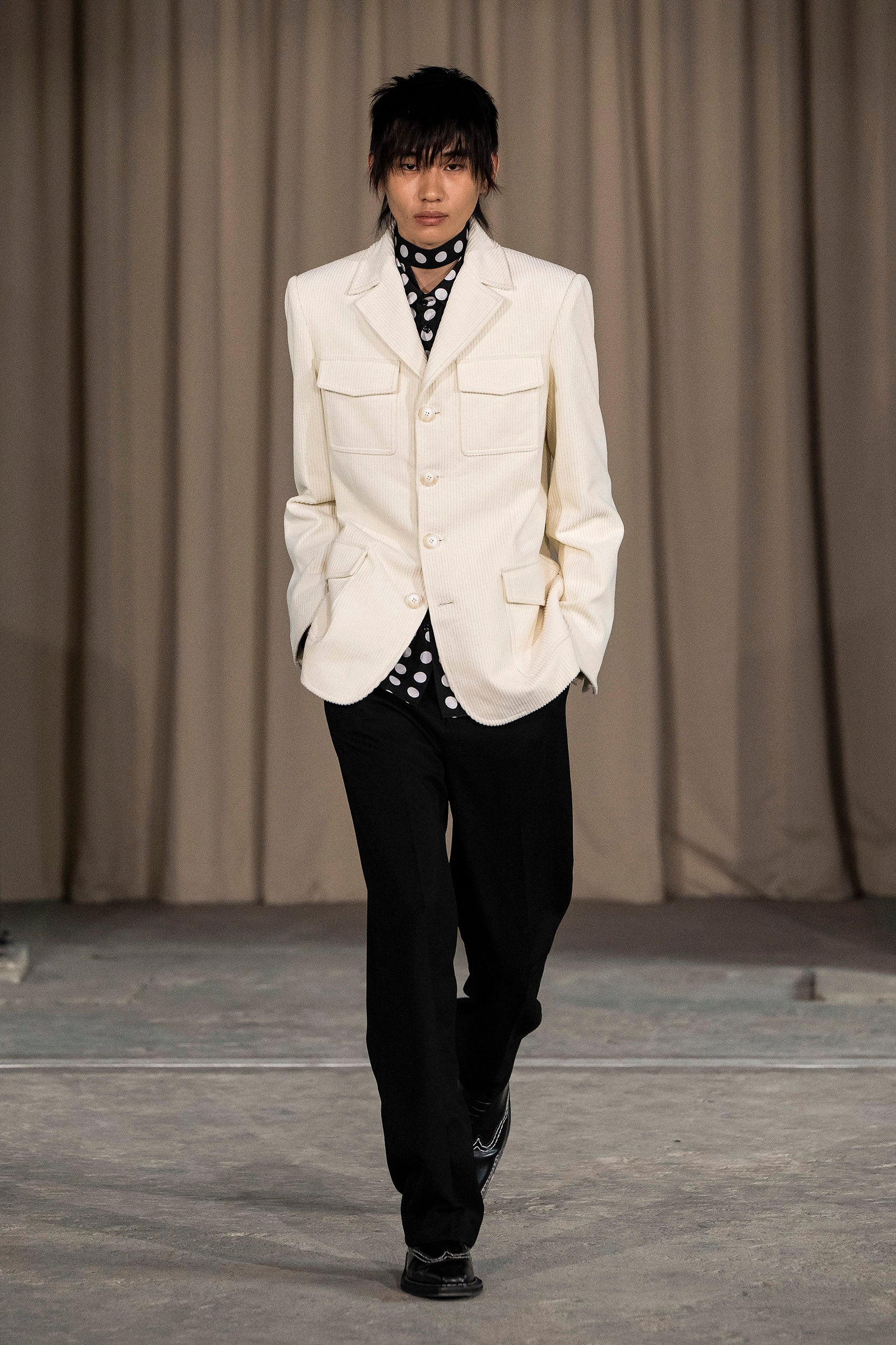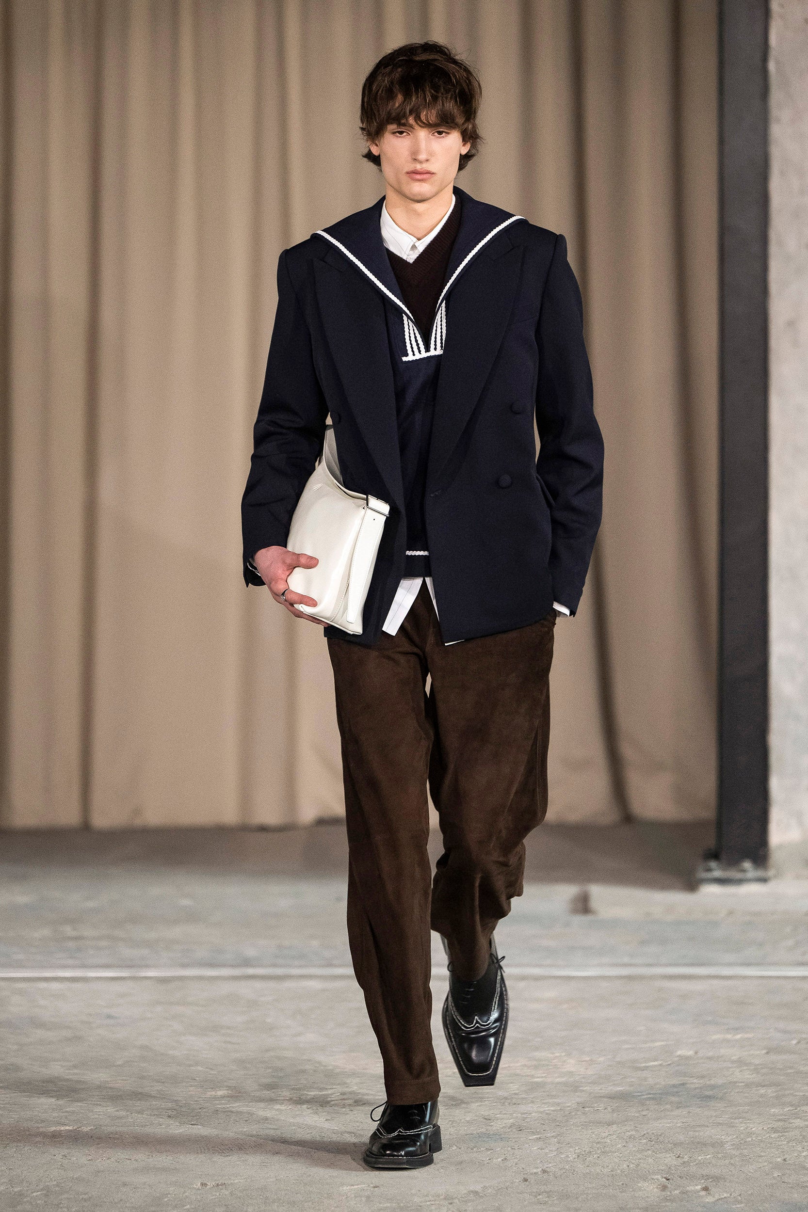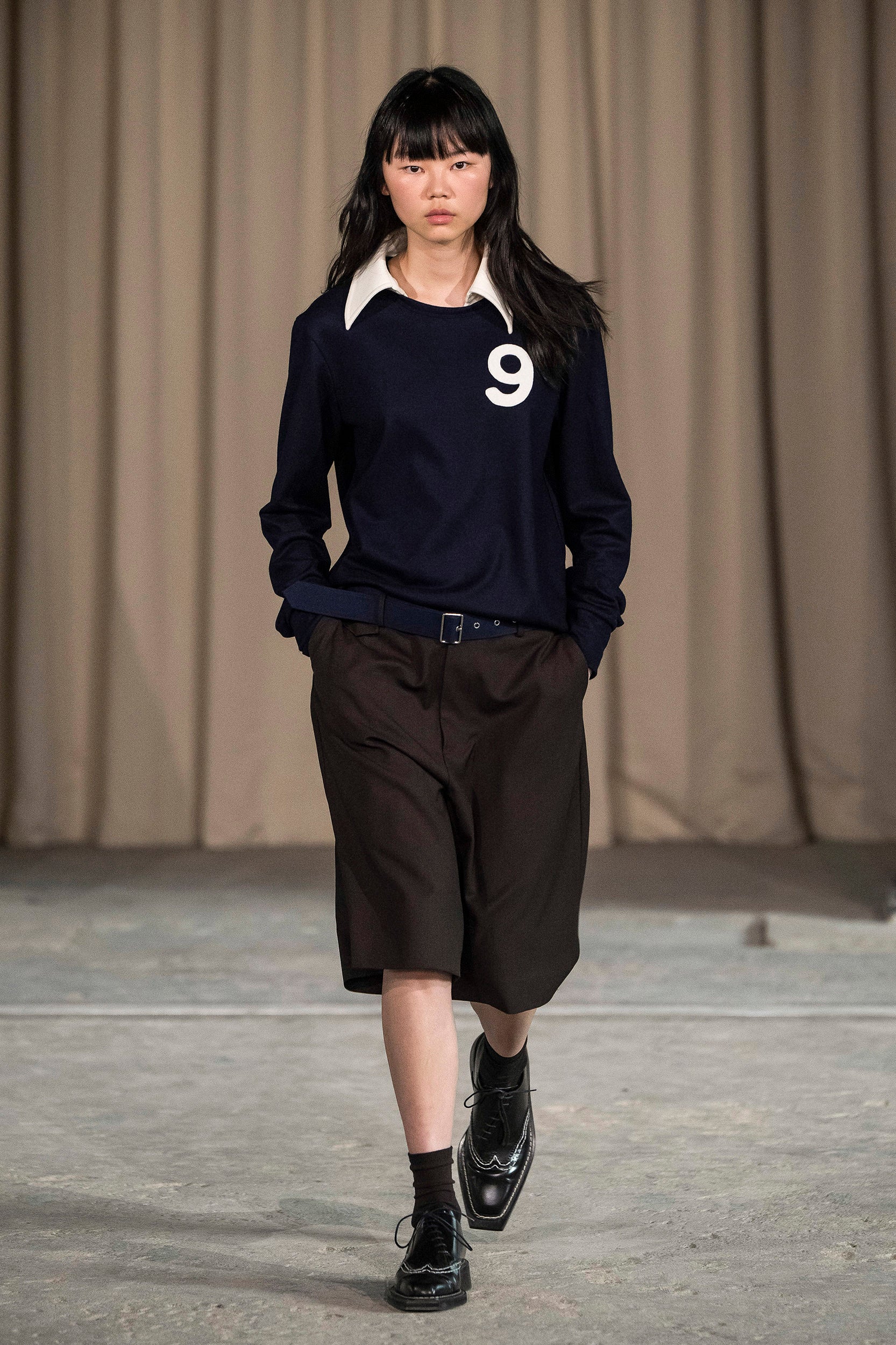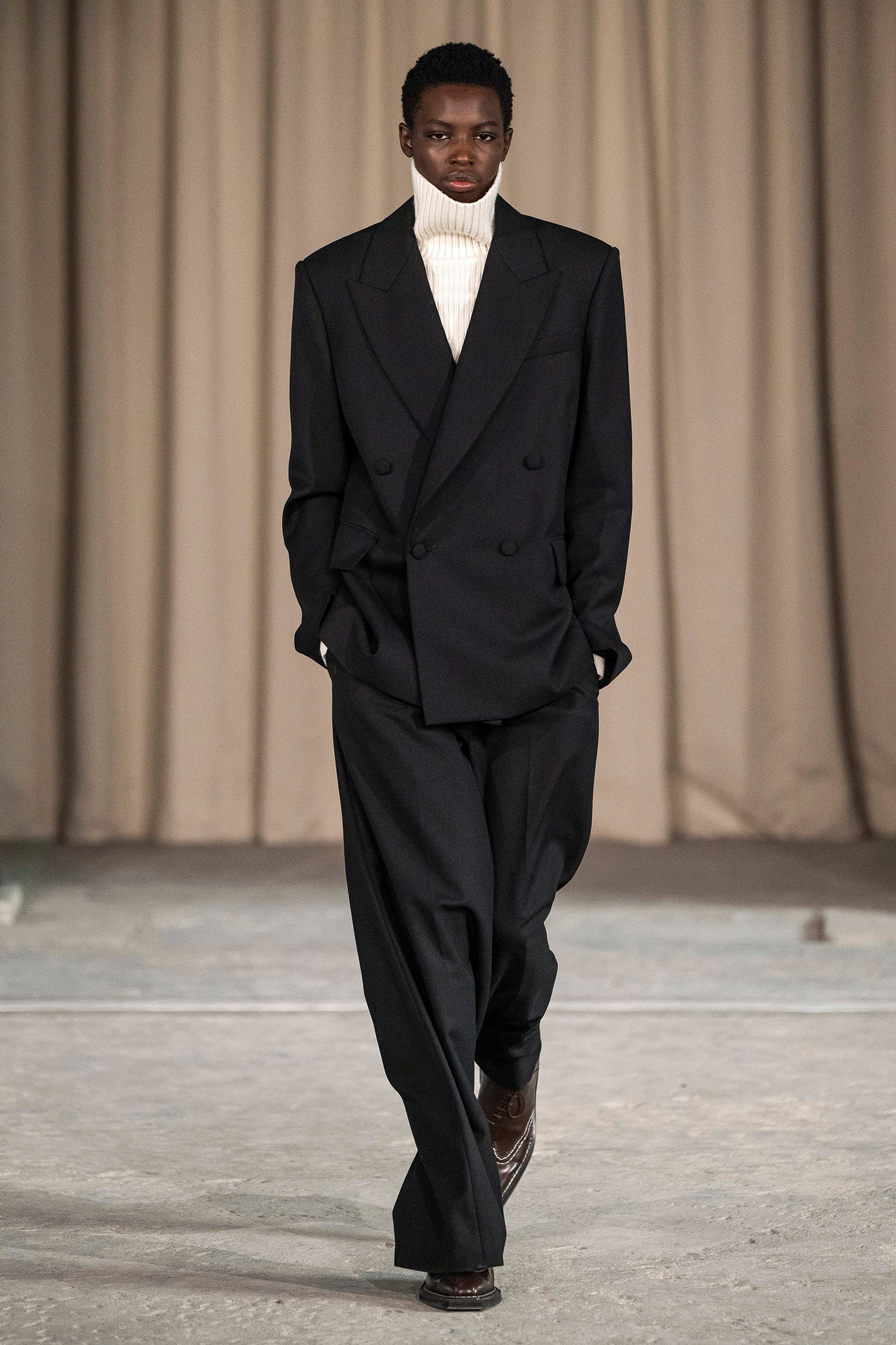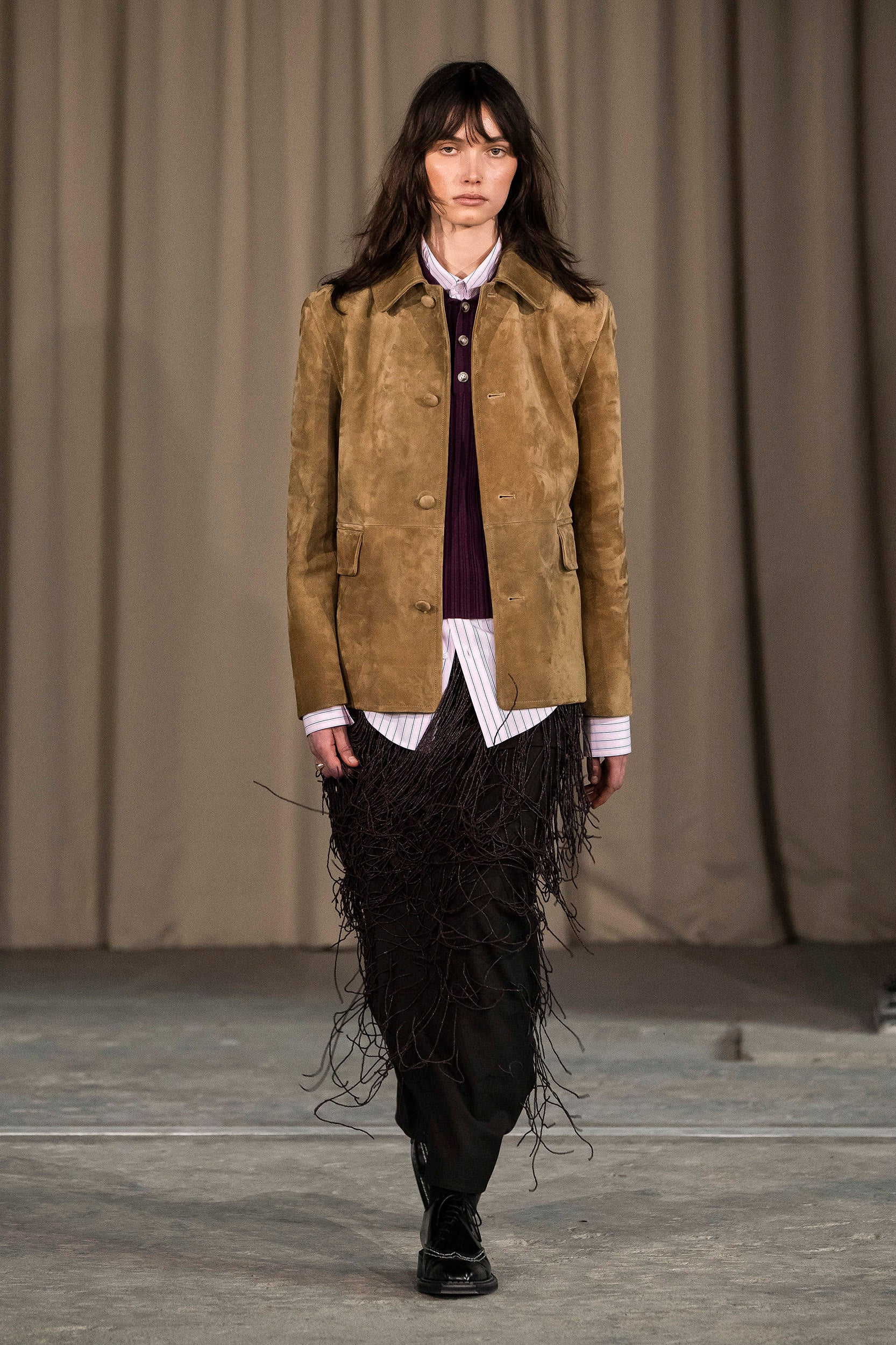 Saccharine pastels clash with rich leathers and wools, while full skirts balance strong-shouldered tailoring. Classic British wardrobe staples are reimagined, layering nostalgia with modernity. Eccentric textures, and playful contrasts redefine tradition, embracing a multifaceted reality.