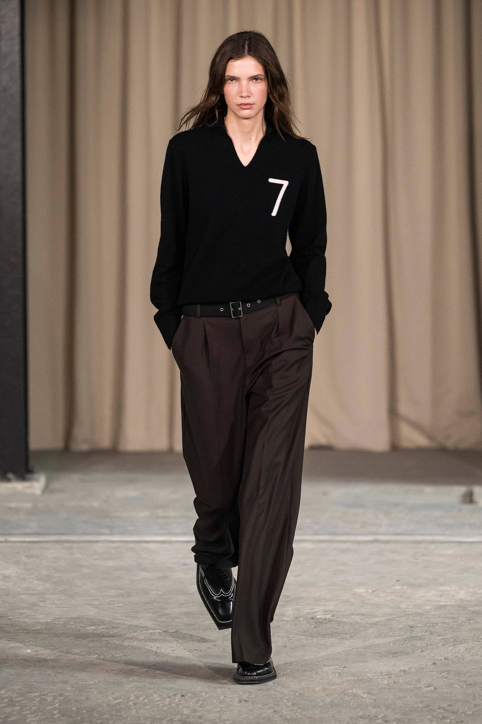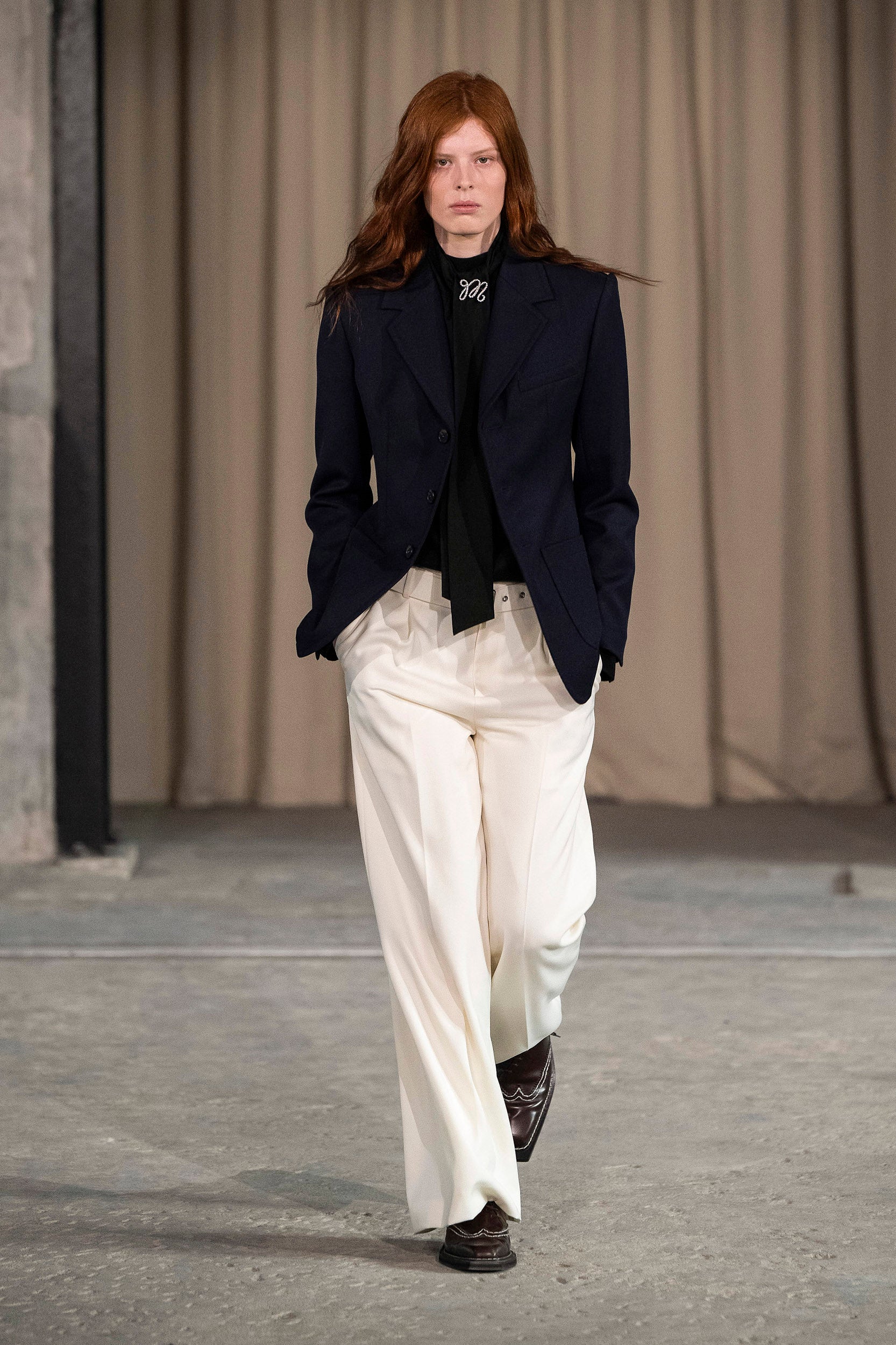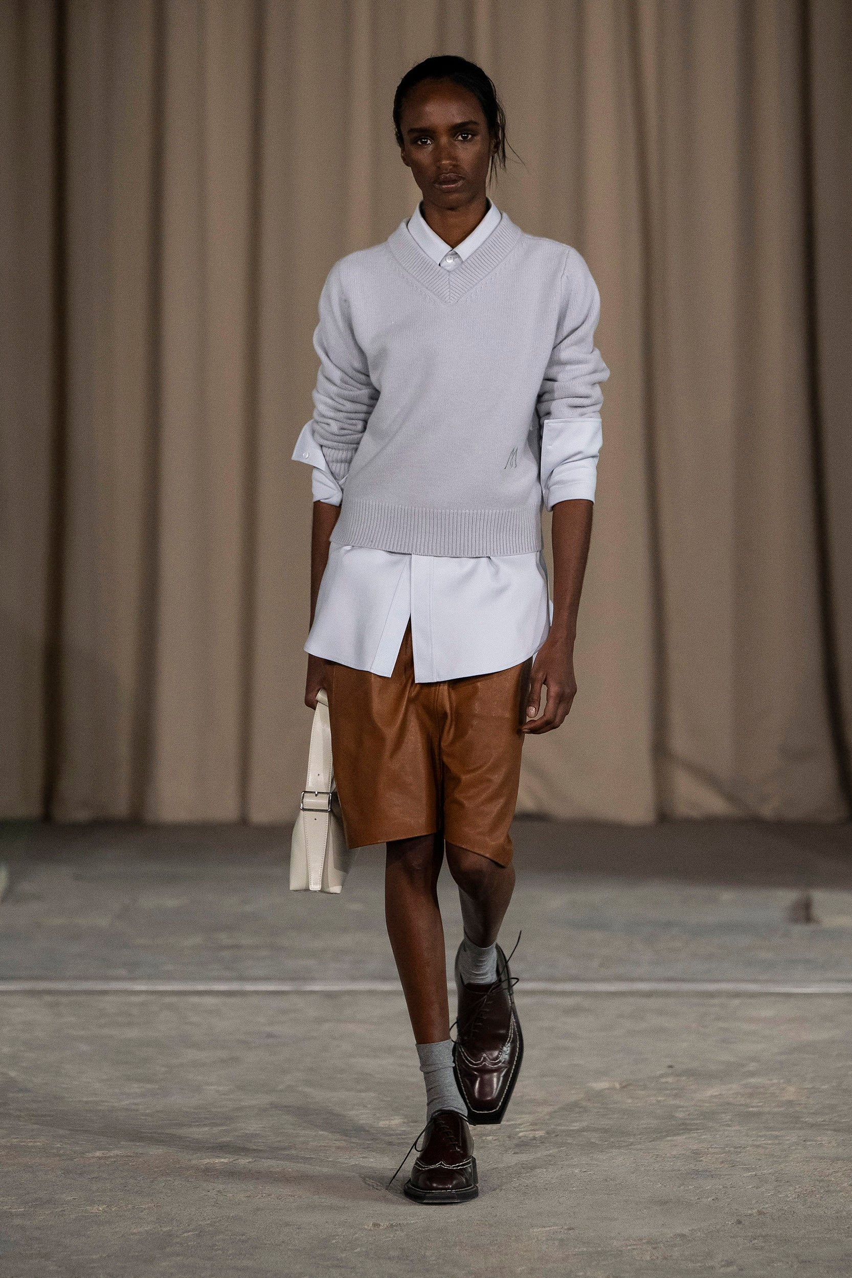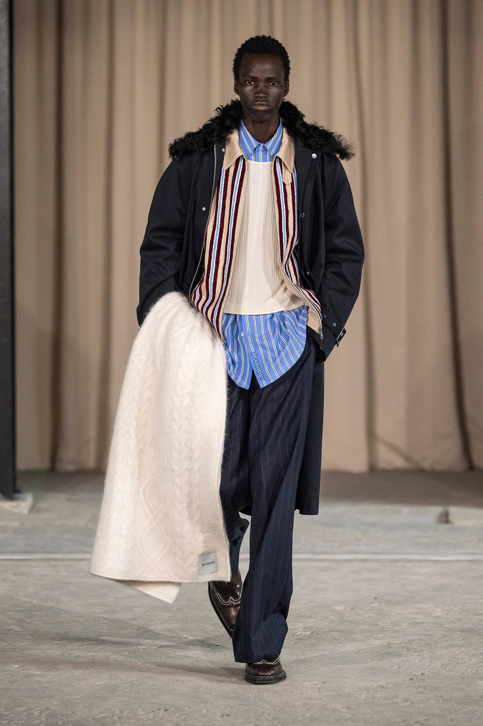 Saccharine pastels clash with rich leathers and wools, while full skirts balance strong-shouldered tailoring. Classic British wardrobe staples are reimagined, layering nostalgia with modernity. Eccentric textures, and playful contrasts redefine tradition, embracing a multifaceted reality.