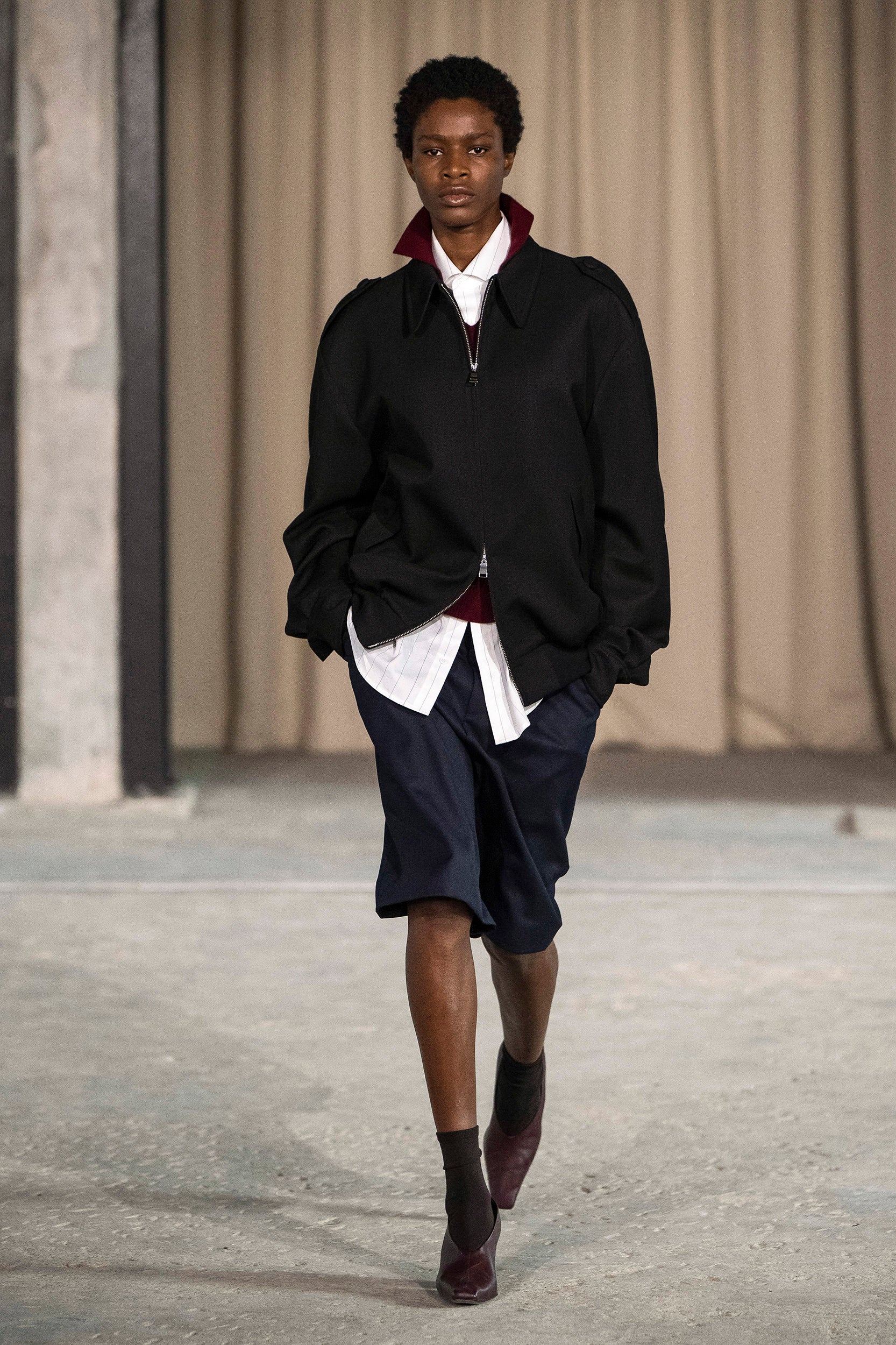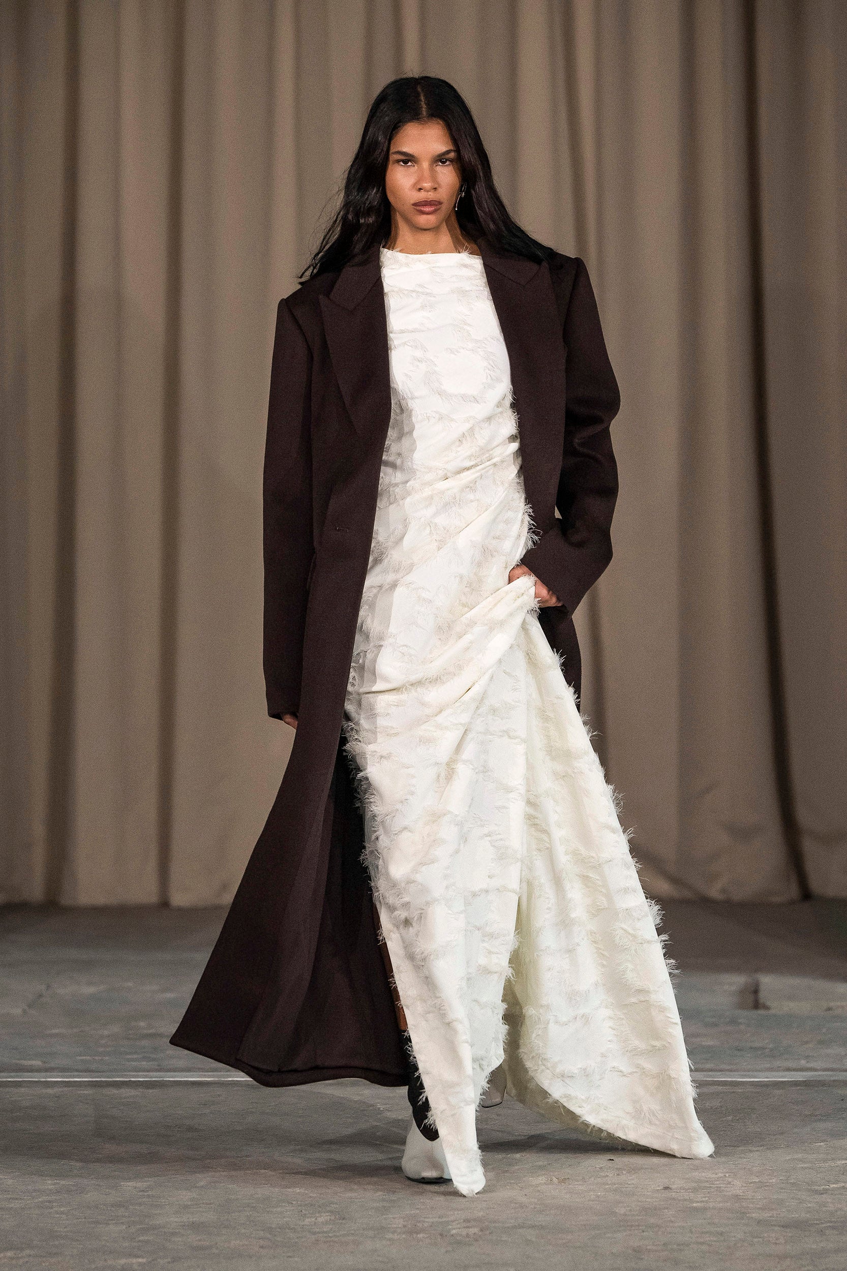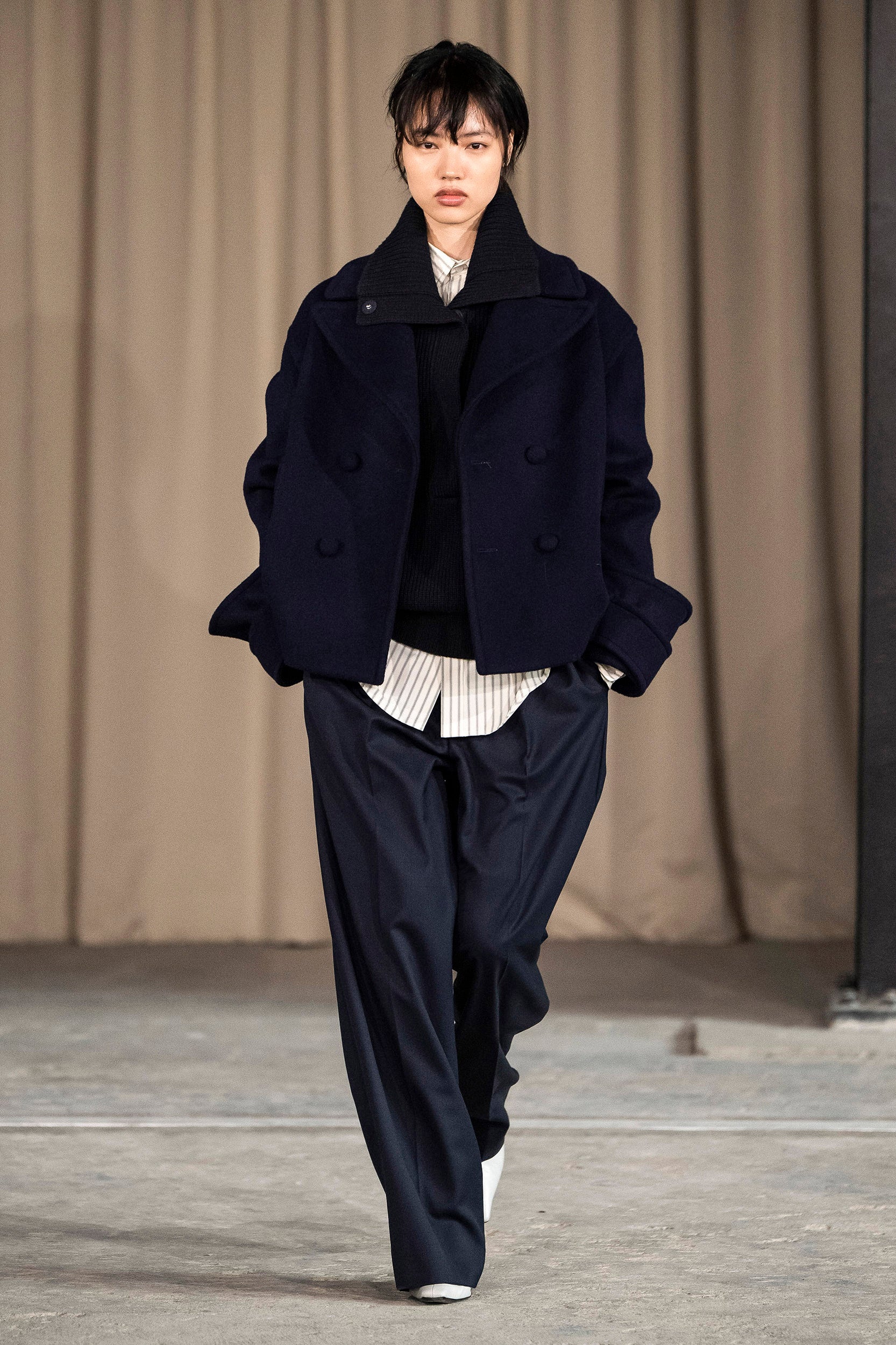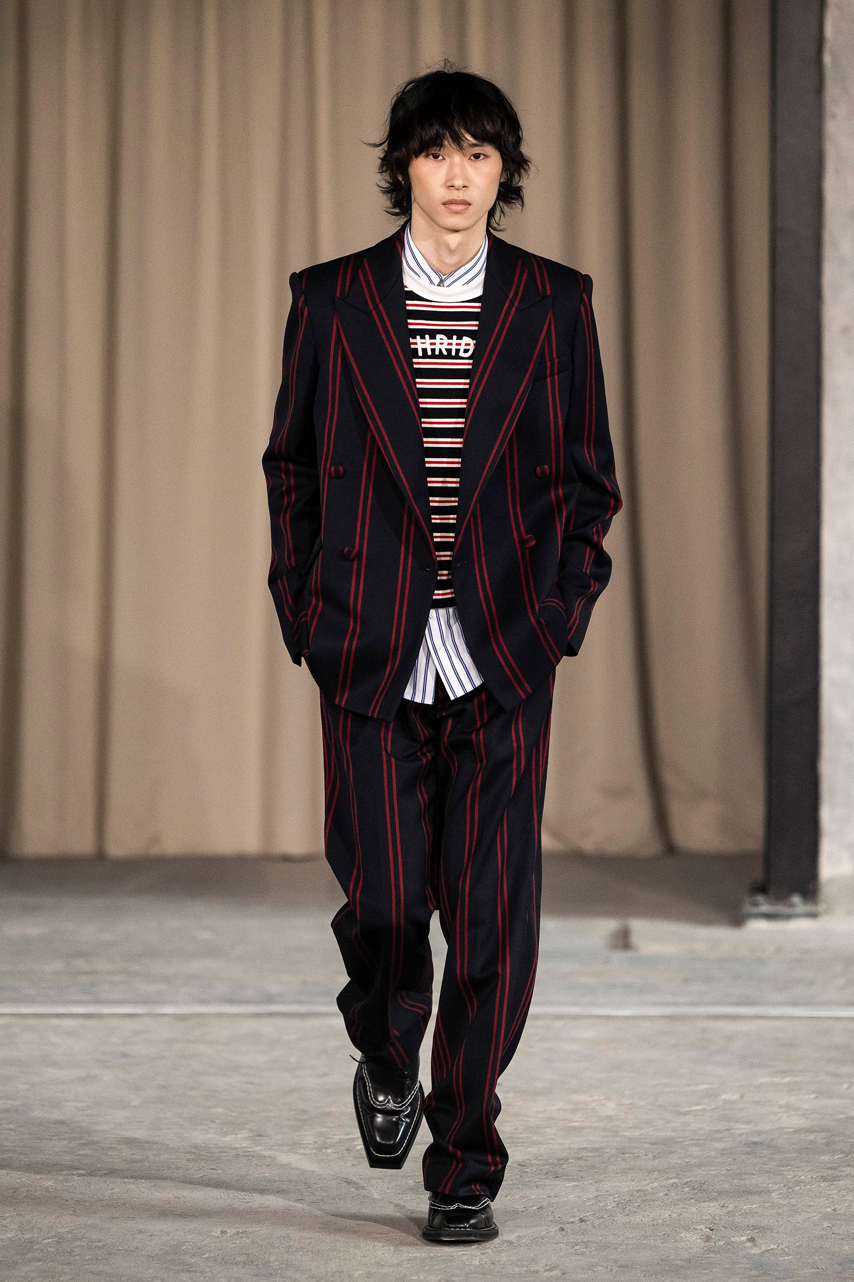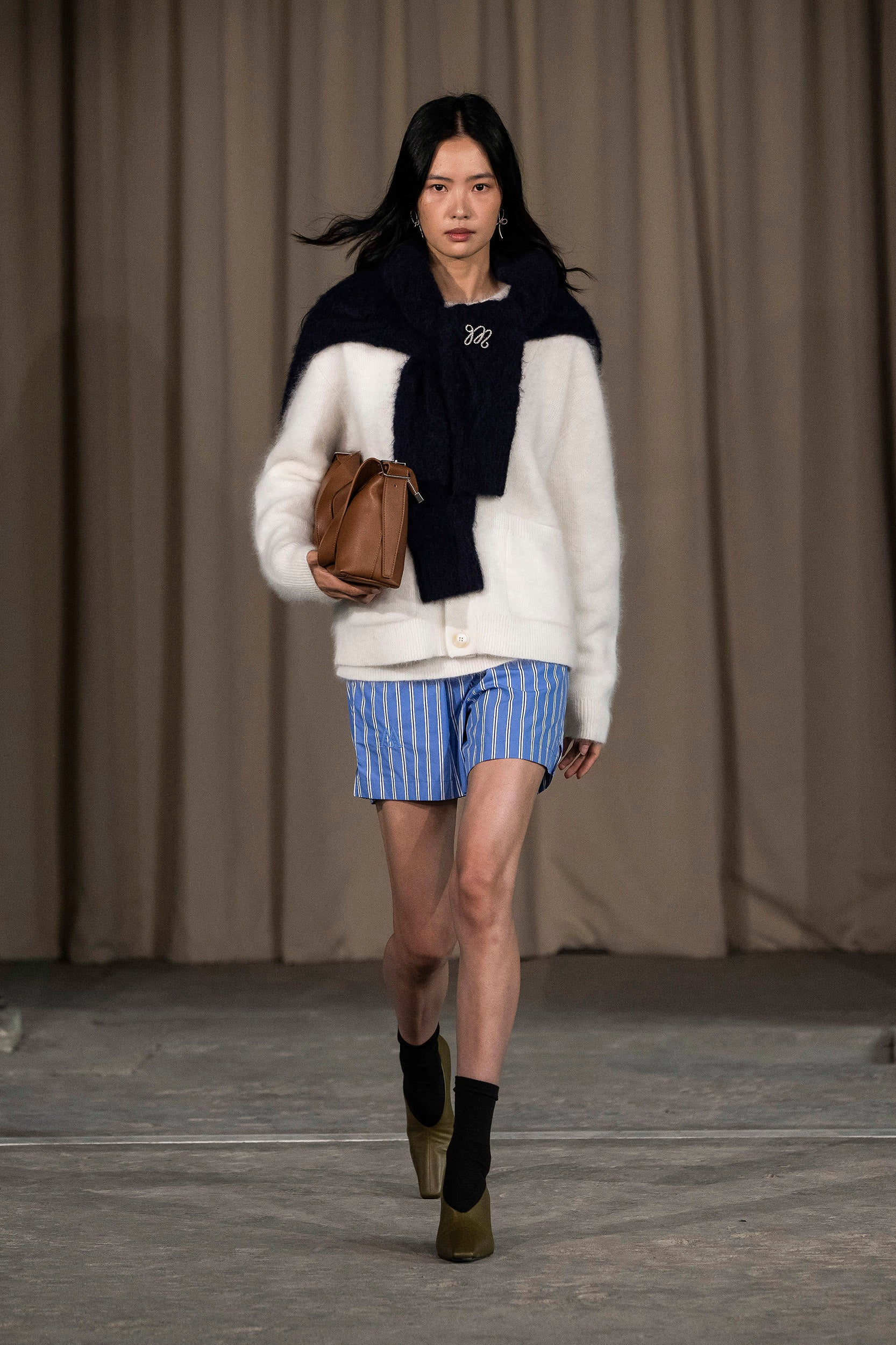 Saccharine pastels clash with rich leathers and wools, while full skirts balance strong-shouldered tailoring. Classic British wardrobe staples are reimagined, layering nostalgia with modernity. Eccentric textures, and playful contrasts redefine tradition, embracing a multifaceted reality.