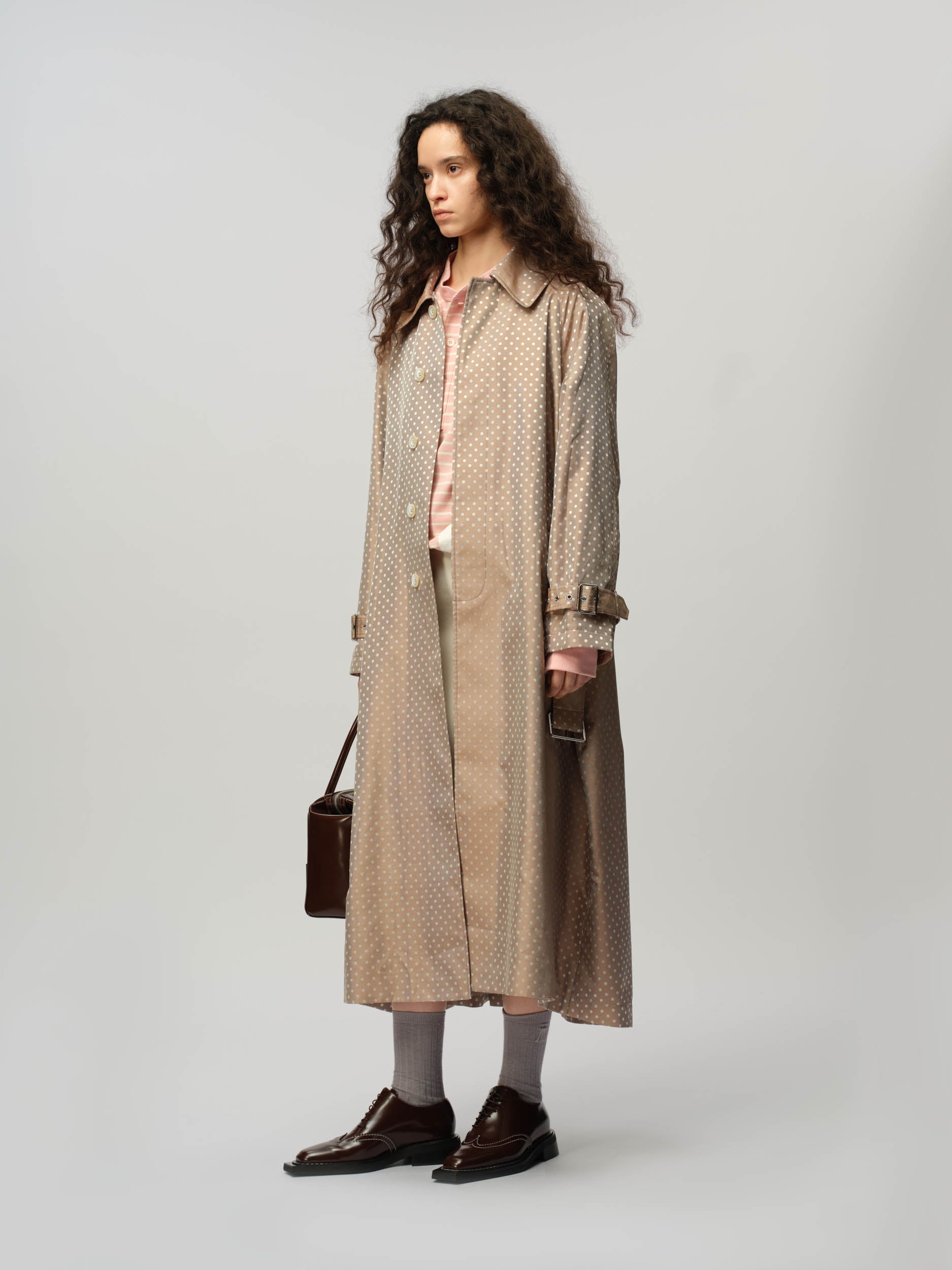 View Similar ProductsTrench coat crafted in a Jacquard spot print. Features a front button-up closure and a belt at the waist. Cut to a relaxed fit and below-knee length.