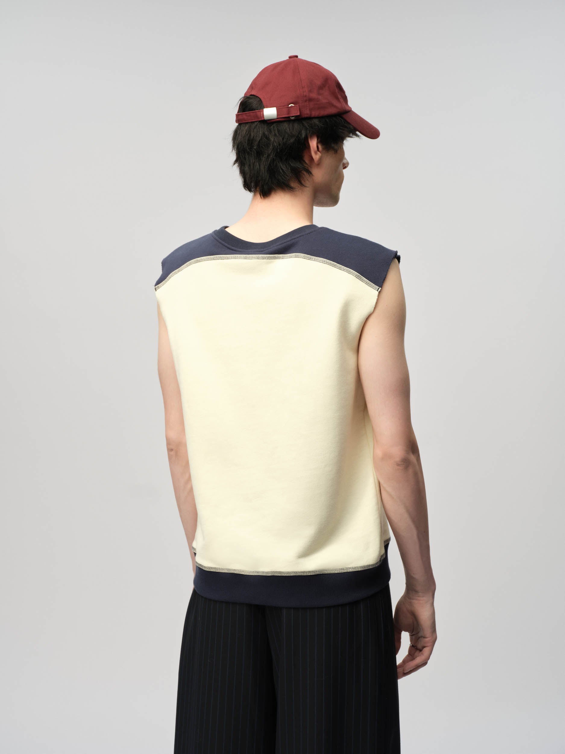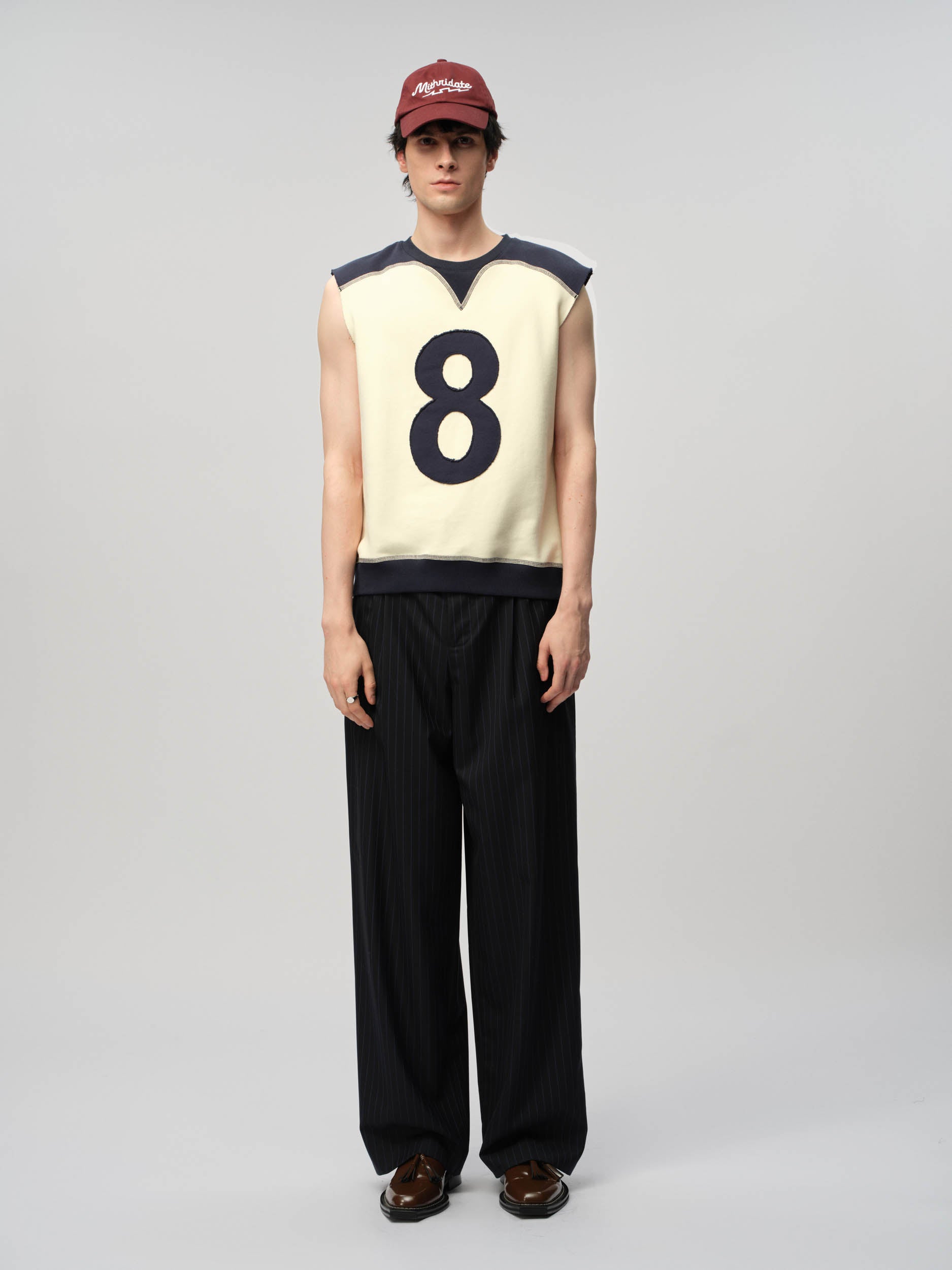 View Similar ProductsSleeveless vest featuring M shape style line on front, contrasting navy rib hem, shoulder panels and an appliqué number 8. Cut to a regular fit and hip length.