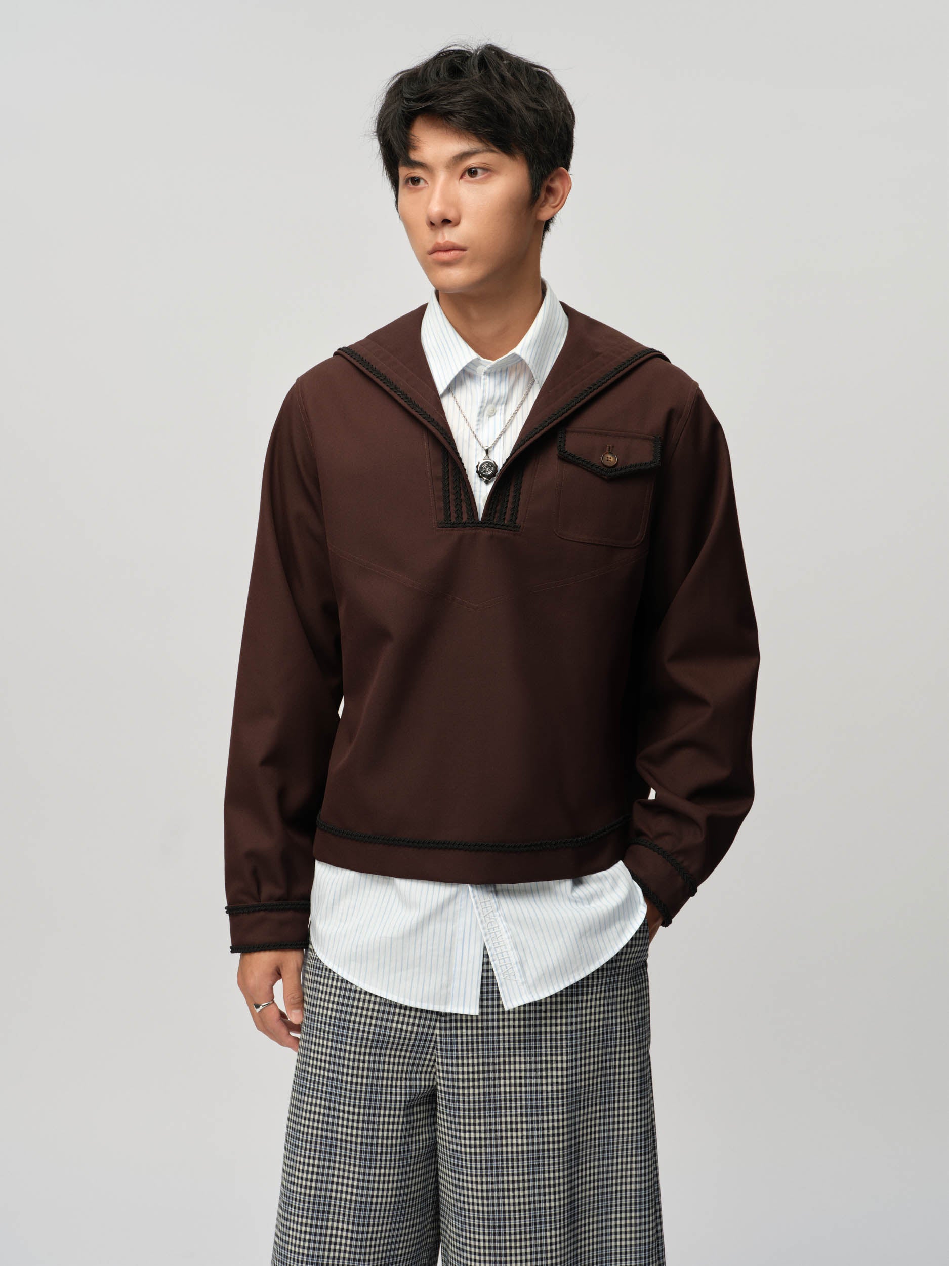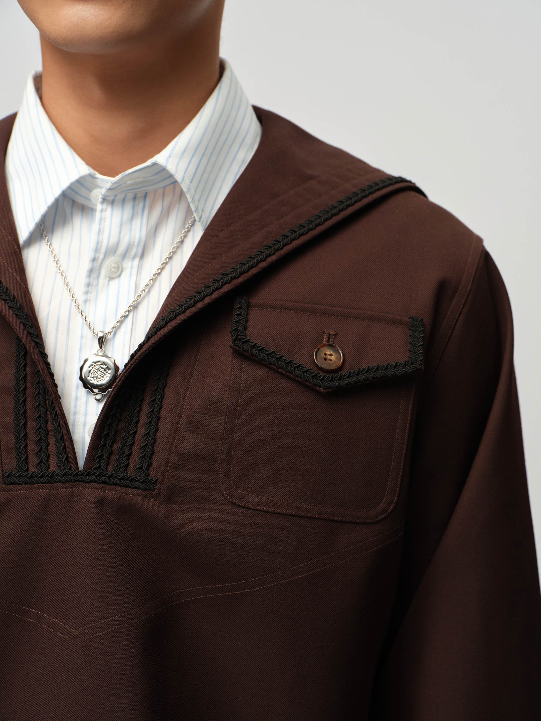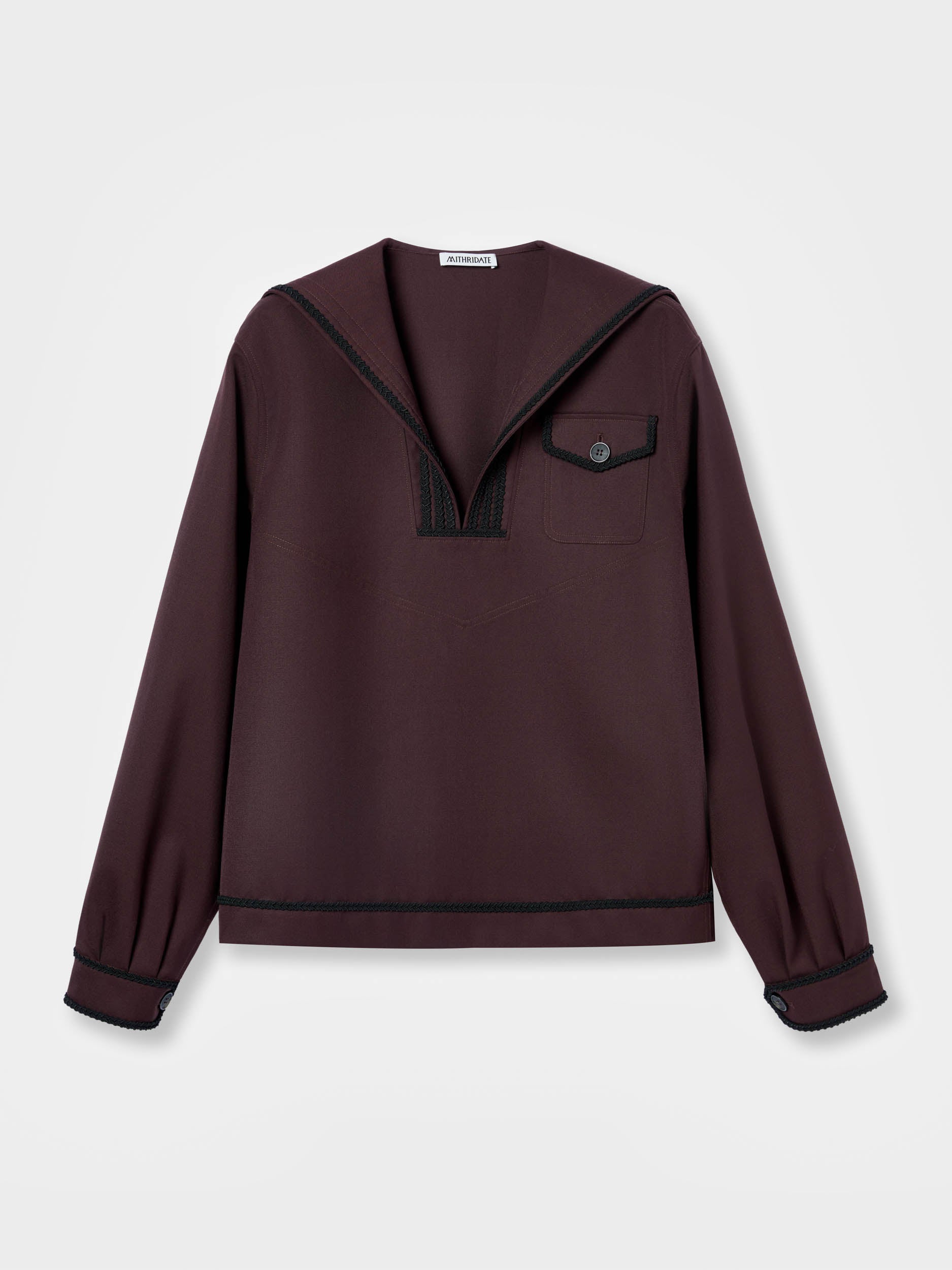 View Similar ProductsUnisex long sleeve sailor top made from wool blend, featuring a braiding trim and classic flap front pocket. Cut to a regular fit and finished at hip length.